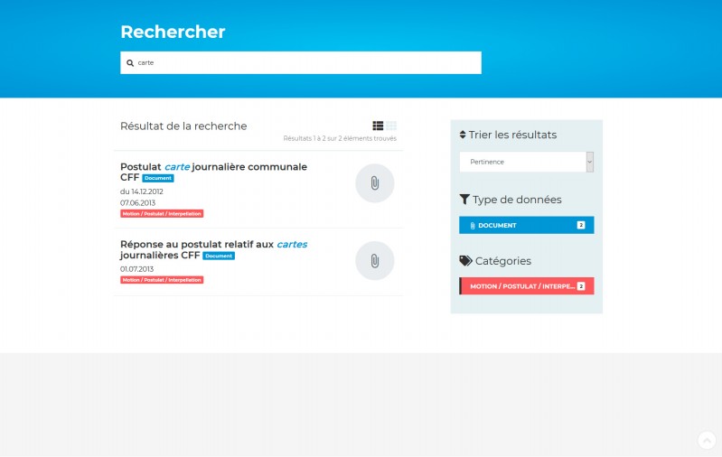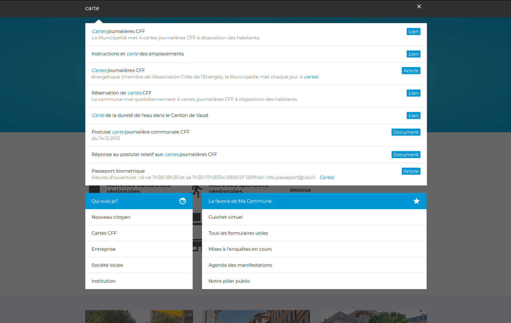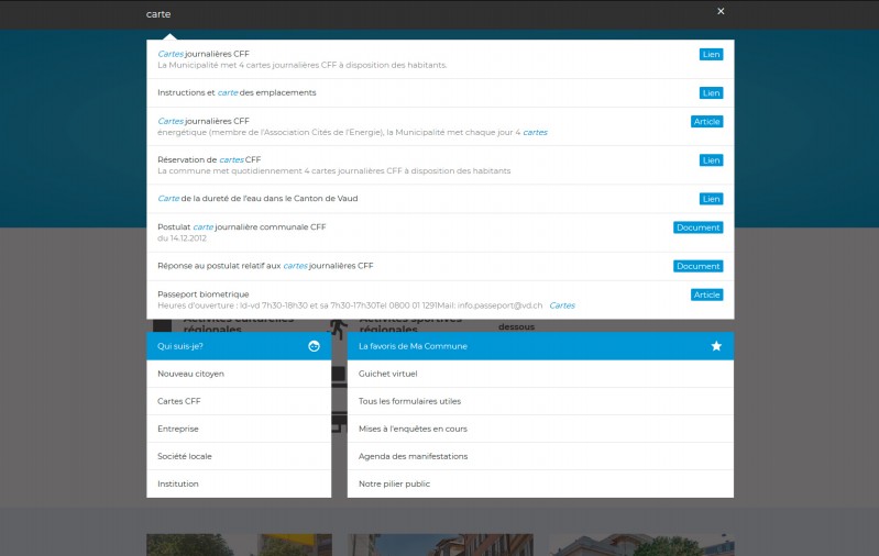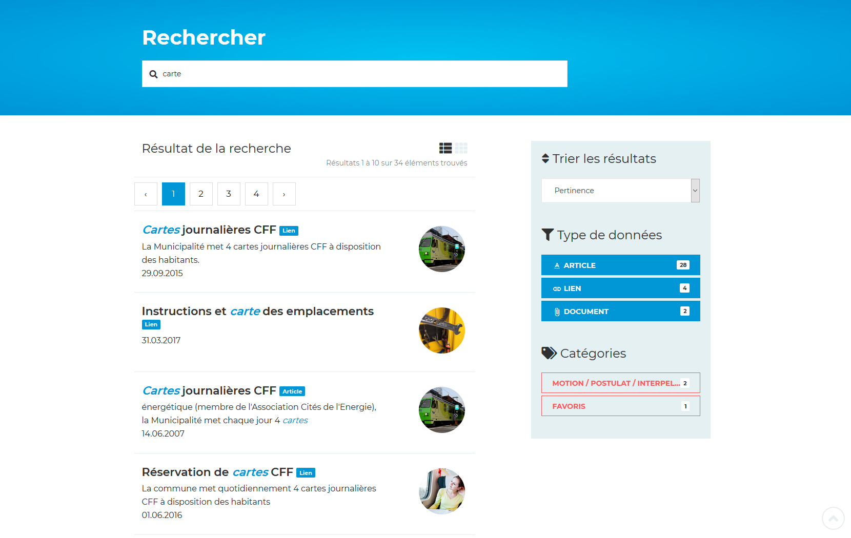 Les résultats proviennent de toutes les sections de votre site, contenus rédactionnels, adresses, évènements, documents, etc...